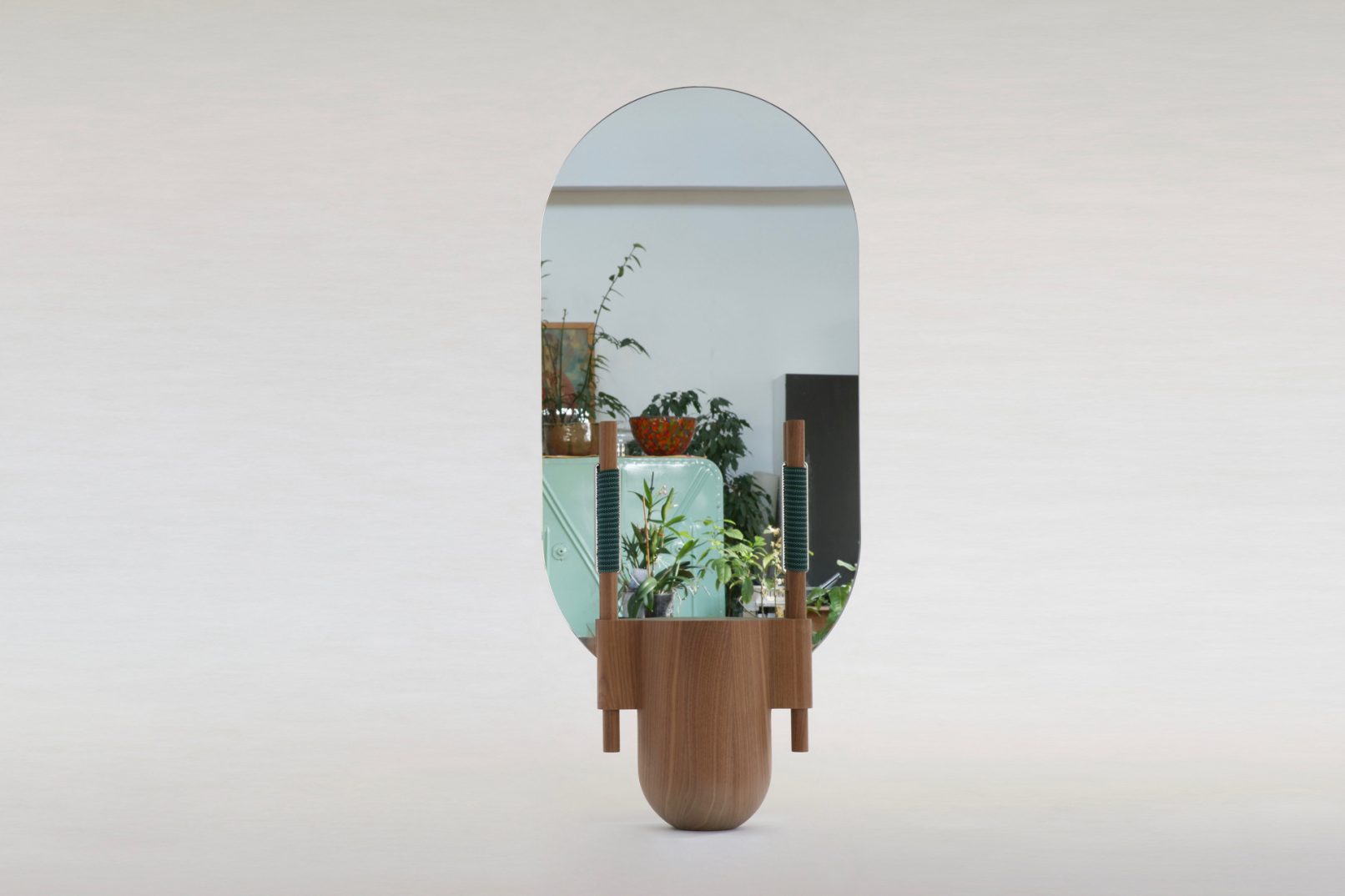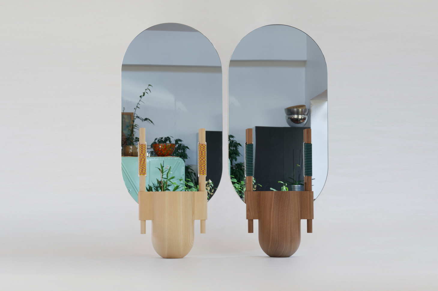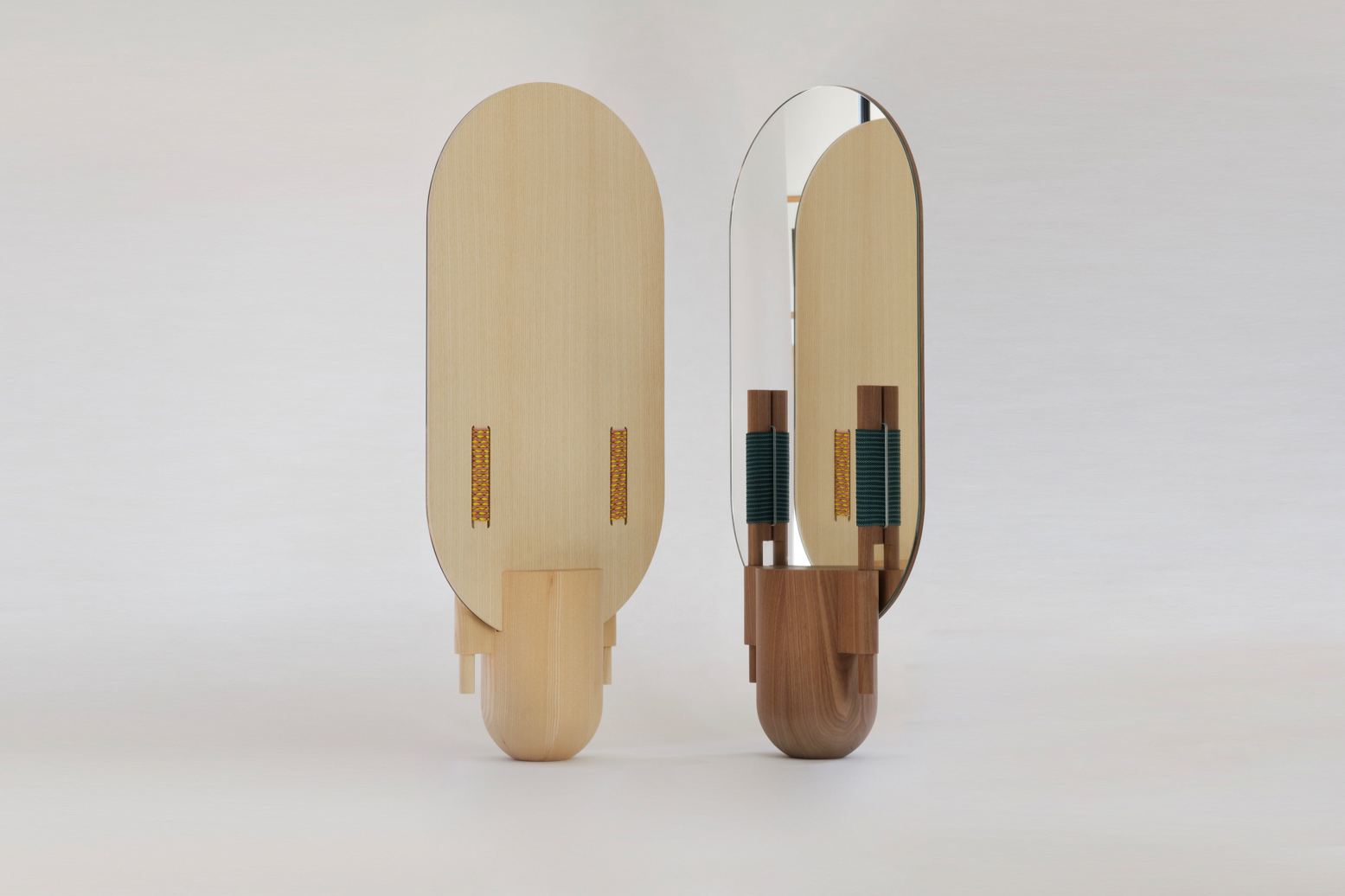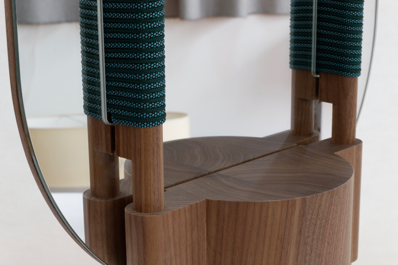 Matériaux : Frêne massif / Noyer US massif, vernis mat, miroir, cordage.