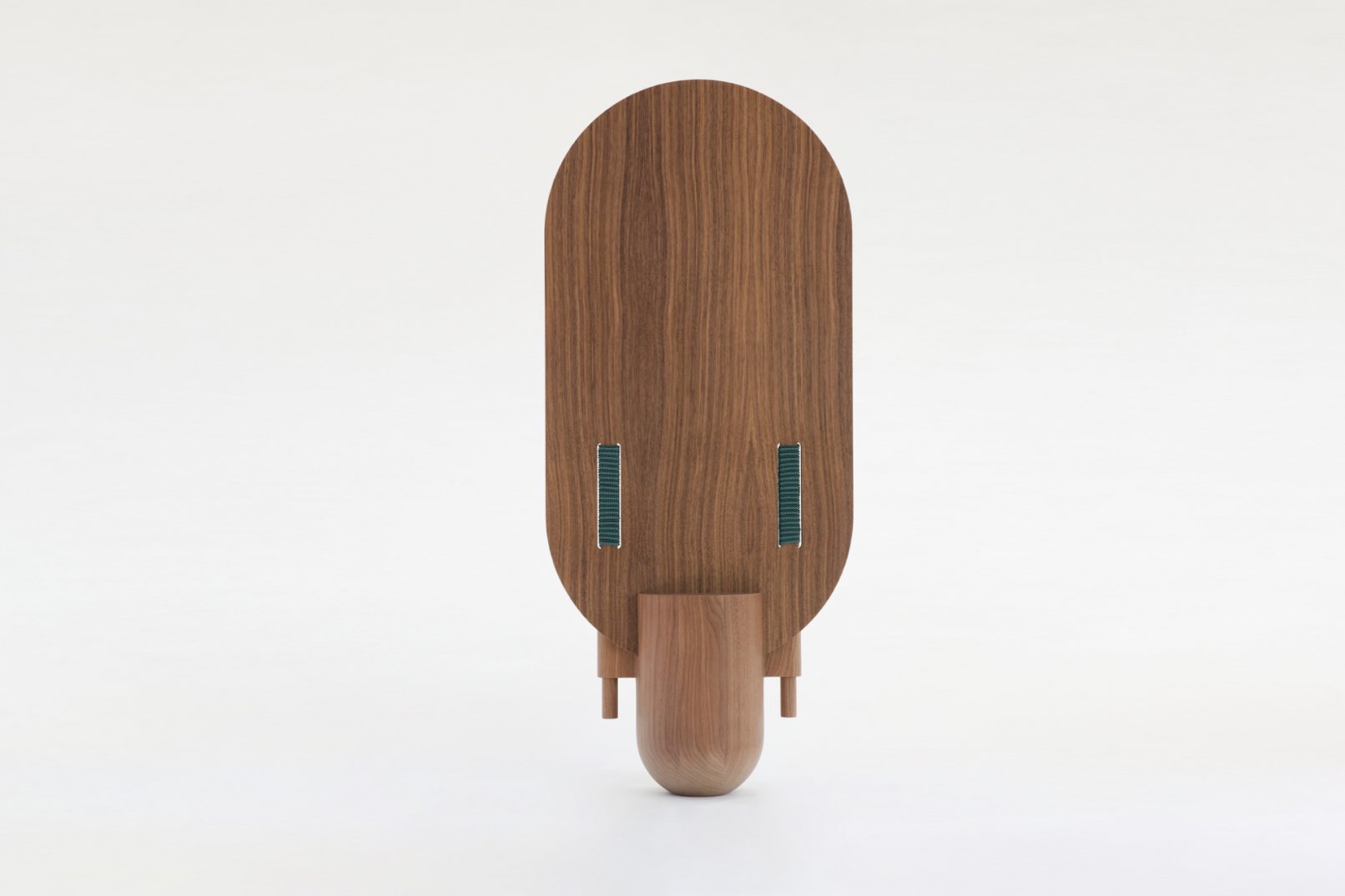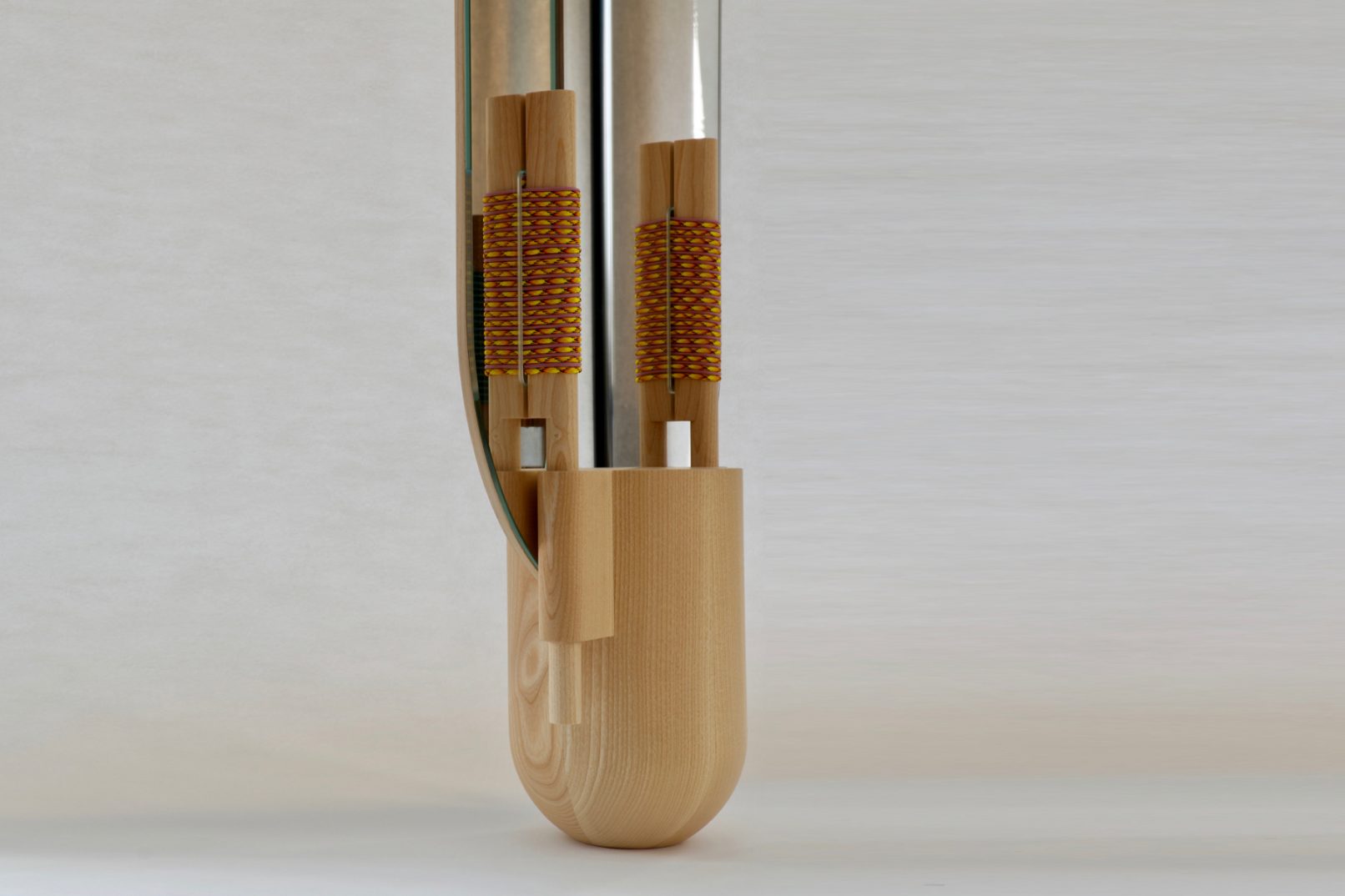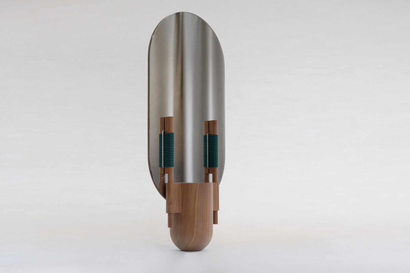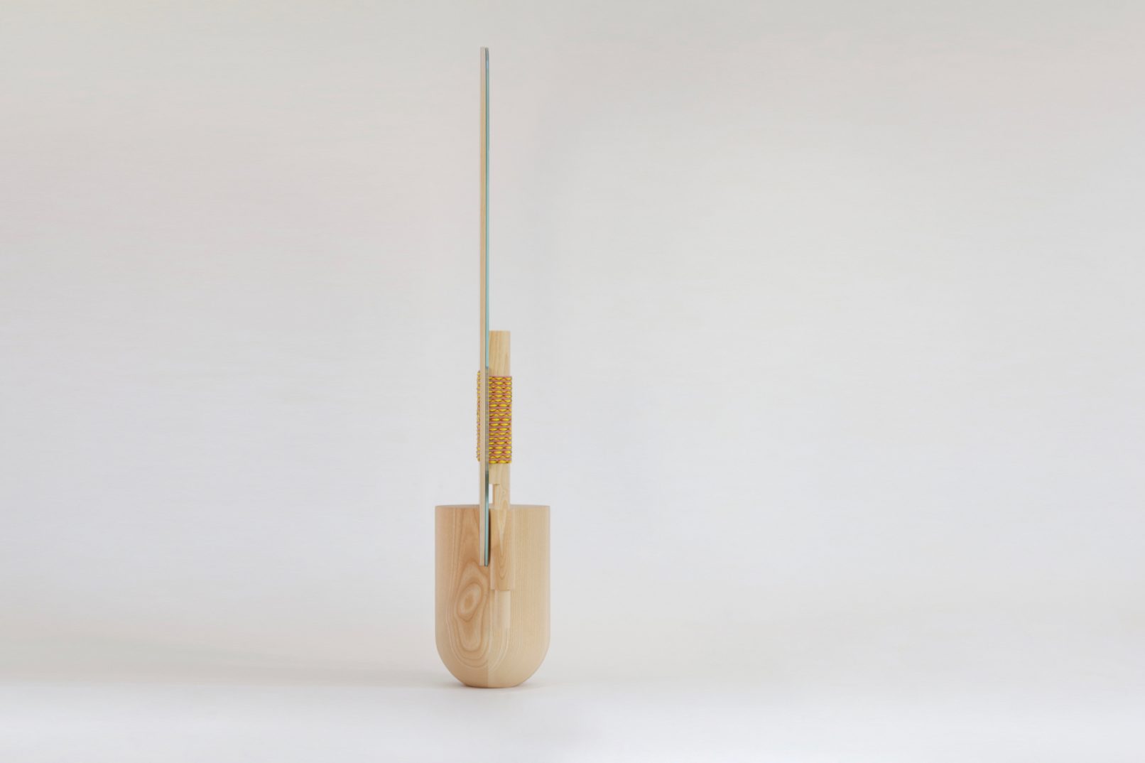 Matériaux : Frêne massif / Noyer US massif, vernis mat, miroir, cordage.