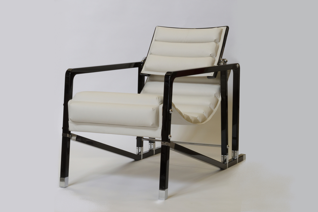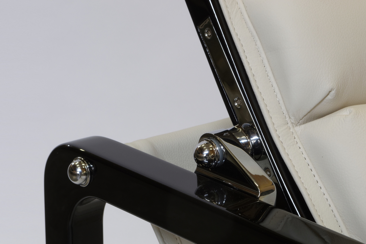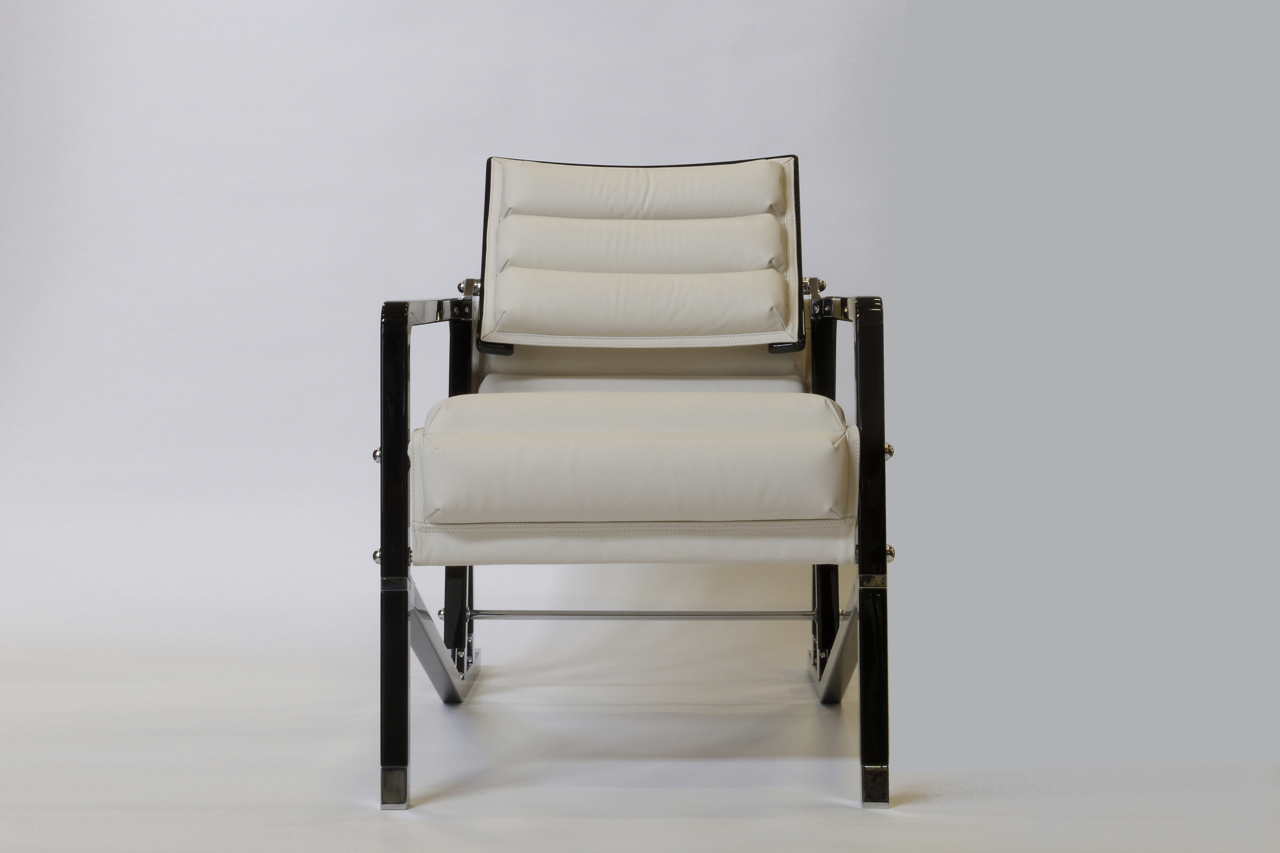 Matériaux : Structure en hêtre massif, assise et dossier en cuir, quincailleries en laiton poli chromé, laque polie.
